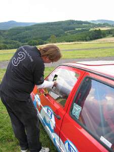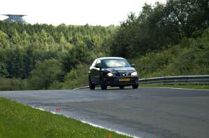 SaturdayA leisurely start saw me arriving at the Ring at about 14.30 hours. Driving leisurely was a good thing too, as the Polizei had set up a speedtrap in the 70km/h zone on the B-258 near Ring Racing.A quick look at the carpark convinced me that the sensible thing to do would be to go straight out onto the track. Right behind the barriers I spotted Stelvio, who was standing around looking at the world going by. The track looked rather damp and slippery here and there. The braking zone for Aremberg and the exit of Bergwerk proved that a slow sighting lap was once again a sensible thing to do. At Spiegelkurve (or Chicane, in Jochen-speak) (the left-right before Miss-Hit-Miss (or Dreifach rechts)) there was an enormous load of oil-absorbing dust. Apparantly a 911 had rolled and hit the armco in two places. During the rest of the day a local speed limit of 50km/h was put in place. Despite the leisurely start of the day, I managed to forget to bring a bottle of juice with me. Time for a trip to the local supermarket, then. Oh wait, there's no such thing in Nürburg. Better pop down to the nearest town. Using the fastest route, of course. On the way there I spotted Jochen at Mattzgesfeld. Luckily he spotted me too, resulting in the first ever picture of the Ibiza on the track.