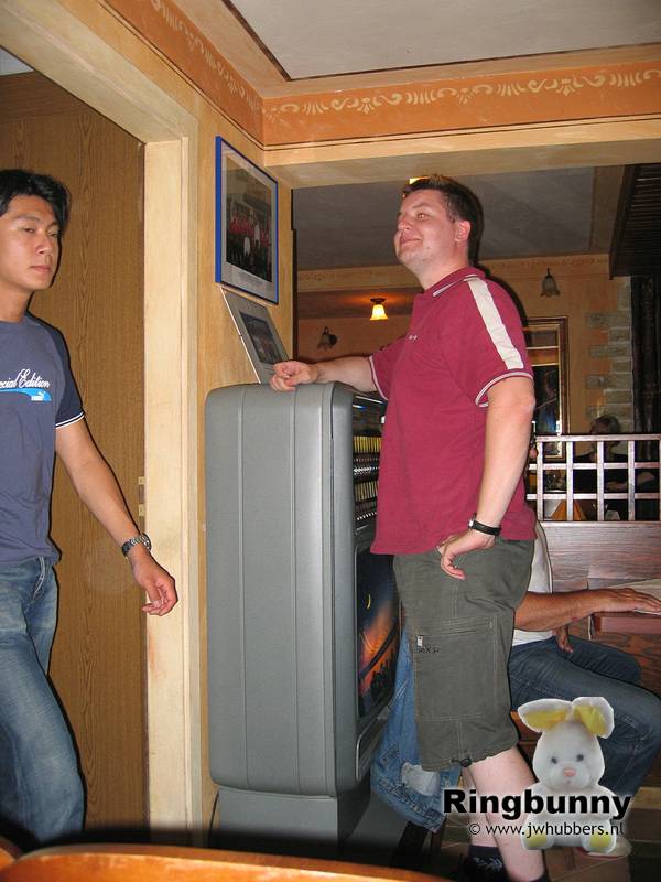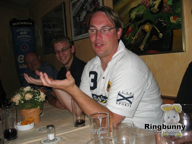 At some point an Asian-looking guy entered the restaurant, and Job (who knows everybody who's in any way connected to motorsport) pointed out that that was Ho-Pin Tung, who might well be the first Chinese F1-driver. As a picture of such a potential star might become a very valuable collectors item, we positioned Jochen near the exit of the bathroom (into which mr. Tung had disappeared) to signal us when he was coming back. The signalling bit didn't quite work, but several pics of our star-to-be were taken nevertheless.