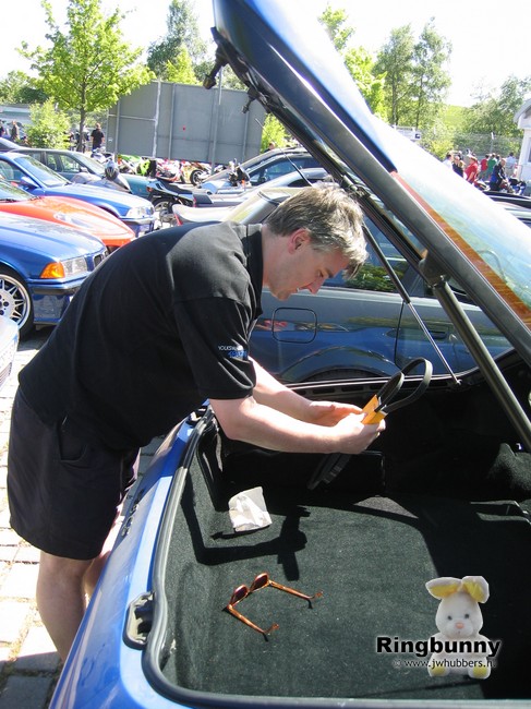 We managed to keep this up all the way to Wippermann, where I got some help in the form of a properly driven Exige (a black one). He came flying past when the Swiss Exige closed the door on him and almost ran him off the track. I'd tagged along behind the black Exige, and with the left indicator on, flashing the high beams and honking the horn I finally made it past him going into Eschbach. It would have been even better if he'd let me by going into Brünnchen, but at the time I was glad to be able to continue at normal speeds. The lap after that Euan went ahead, with me hoping he'd slow down to give me a chance to keep him in sight. This excellent plan went out the window the moment a 997 GT3RS accelerated past us: Euan put his foot down and started chasing it down. He was staying on its tail to Hatzenbach, where a yellow flag gave me a chance to catch up. At that point a white 968 wanted past, and I lost touch with Euan and the RS. Not that I would have been able to keep up, but the white 968 did slow me down a little. The rest of the lap was quite messy, with a little too much traffic around for my liking. I did a third lap in the hope that things would improve, but they most certainly didn't: going into T13 a red BMW E36 decided to dive to my inside for a classic undertaking manoever. Quite neat when you're racing; not so smart during Touristenfahrten. Ah well, that's why you check your mirrors... A helpful spectator was warning us of a crash that had occurred at Hocheichen. I enjoyed the sight of a blue 964RS overtaking me, then let a 944 by going into Aremberg. This time there was no traffic in Fuchsröhre, allowing me to keep it flat through there for a change. The outside of Kallenhard was a big dirty mess, but by now the normal line was clean again. Up Ex-Mühle the silver 997Turbo that Jochen had a lap in came screaming past as if I was standing still, gulping air like an oversized vacuum cleaner. From there to Eschbach wasn't much to write home about: several boiks and lots of cars, and most of the cars were either slow or didn't watch their mirrors, or both, and most of them didn't indicate to show that they had seen me. When I hit yet another bunch of traffic in Pflanzgarten I decided to drive the remaining few corners like a proper tourist on a sightseeing drive. Time for me to get something to drink and for the car to cool down a little. And to get a passenger lap with Euan. Before we went out, Euan wanted to check the oil level. And I saw him going to the back of a car. I guess he dreams about GT3s and RSs a bit too much :-)